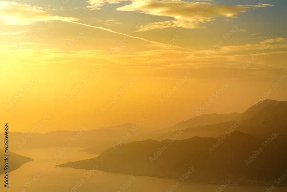 Aerial top view of mountains range and Boka Kotorska bay of Adriatic sea, Montenegro. Picturesque sunset landscape.