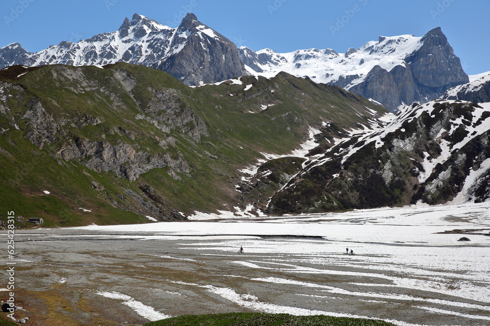 The lac de la Gliere (Gliere lake) located at the end of the valley of Champagny le Haut, Vanoise National Park, Northern French Alps, Tarentaise, Savoie, France, and surrounded by mountains