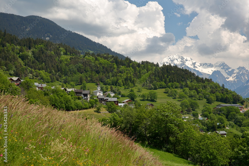 The village of Feissons sur Salins, located above the commune Bozel, Northern French Alps, Tarentaise, Savoie, France, with the Grand Bec summit in the background