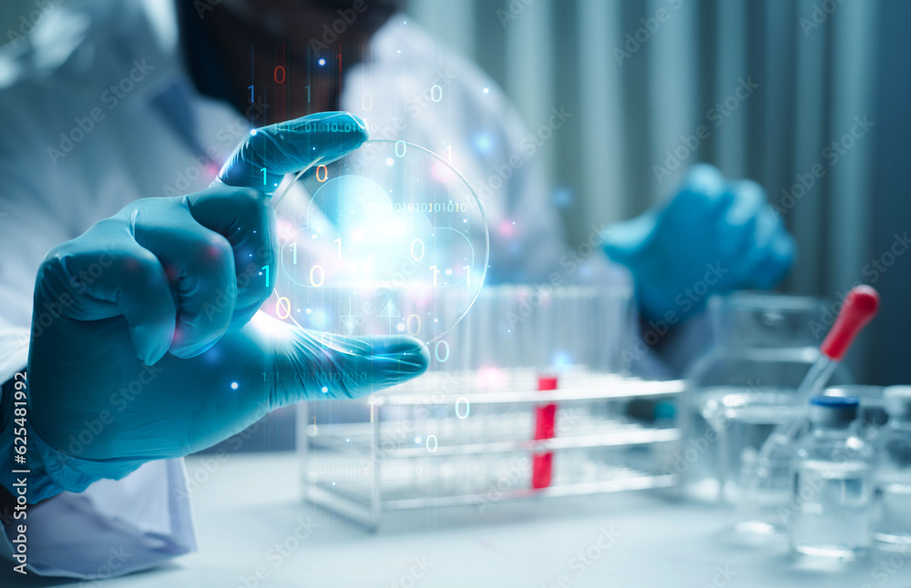 doctor or scientist Shows the linkage of research data through future medical technology cloud storage. cloud technology concept