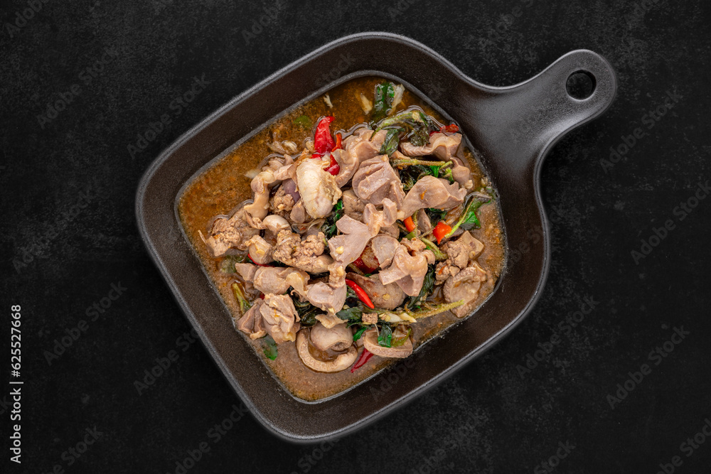 Pad Ka Prao Kruang Nai Gai, Thai food, basil stir fried chicken offal, variety meats, pluck or organ meats in black pan on dark tone texture background, top view, flat lay
