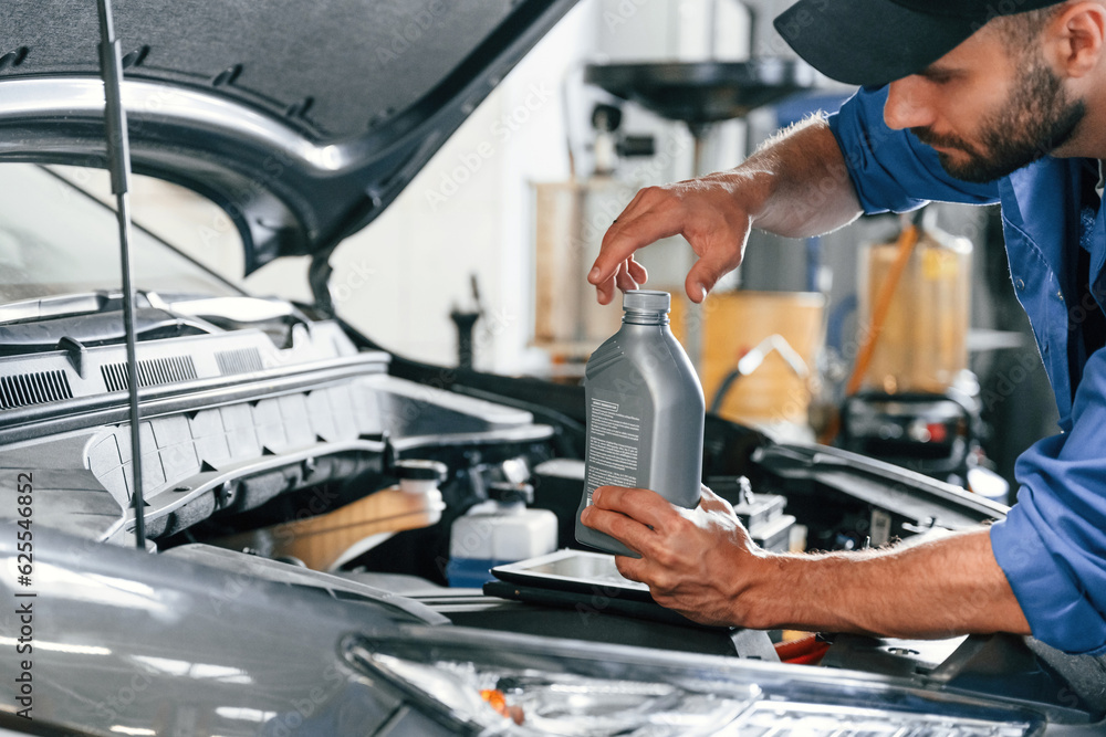 Oil can in hands. Auto mechanic working in garage. Repair service