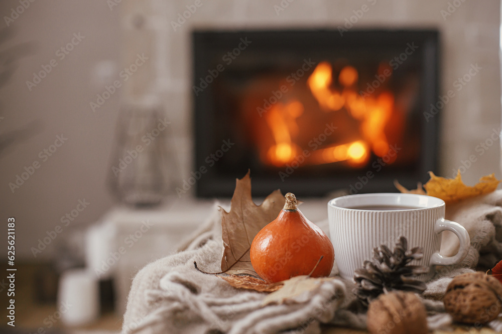 Cozy autumn. Warm cup of tea, pumpkins, autumn leaves, cones, cozy scarf on rustic wooden table on background of fireplace in farmhouse. Comfort fall in rural home. Happy Thanksgiving