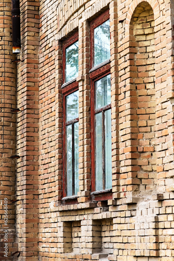 Window with a wooden frame and an old red brick wall with damaged texture