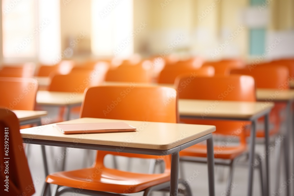 School classroom in blur background without young student. Blurry view of elementary class room no kid or teacher with chairs and tables in campus. Back to school concept