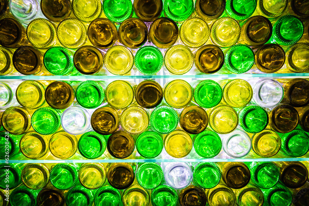 Glasboden, klimaneutral, Mehrweg Flaschen in grün gelb und weiß