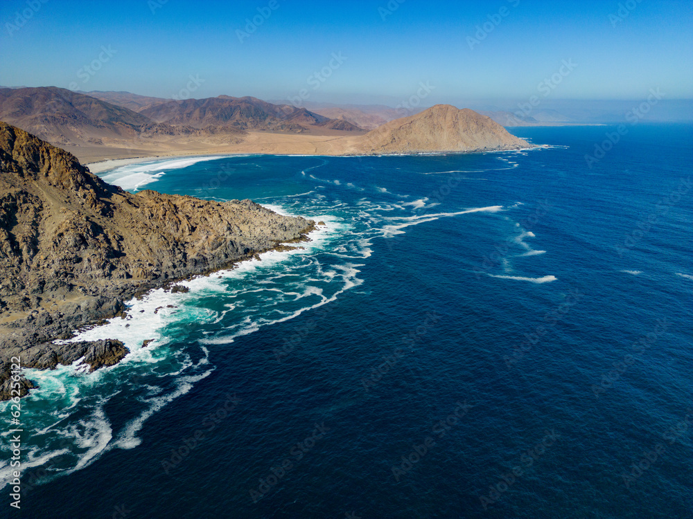 Aerial view of the scenic National Park Pan de Azúcar at the coast of the Atacama desert in Chile - Traveling and exploring South America