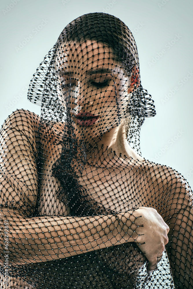 Fashion portrait of beautiful woman in black net on her body and head. Sensual girl