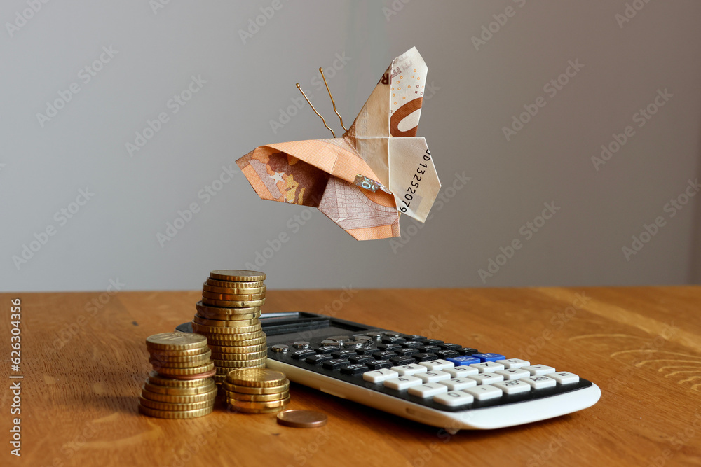 Geld Schmetterling aus Geldschein fliegt über Euro Geldstapel und Taschenrechner. Geld Einnahmen, Haushaltskasse, Finanzen, Steuererklärung, Rechnung, Gehalt bezahlen, Aktien, Gewinn