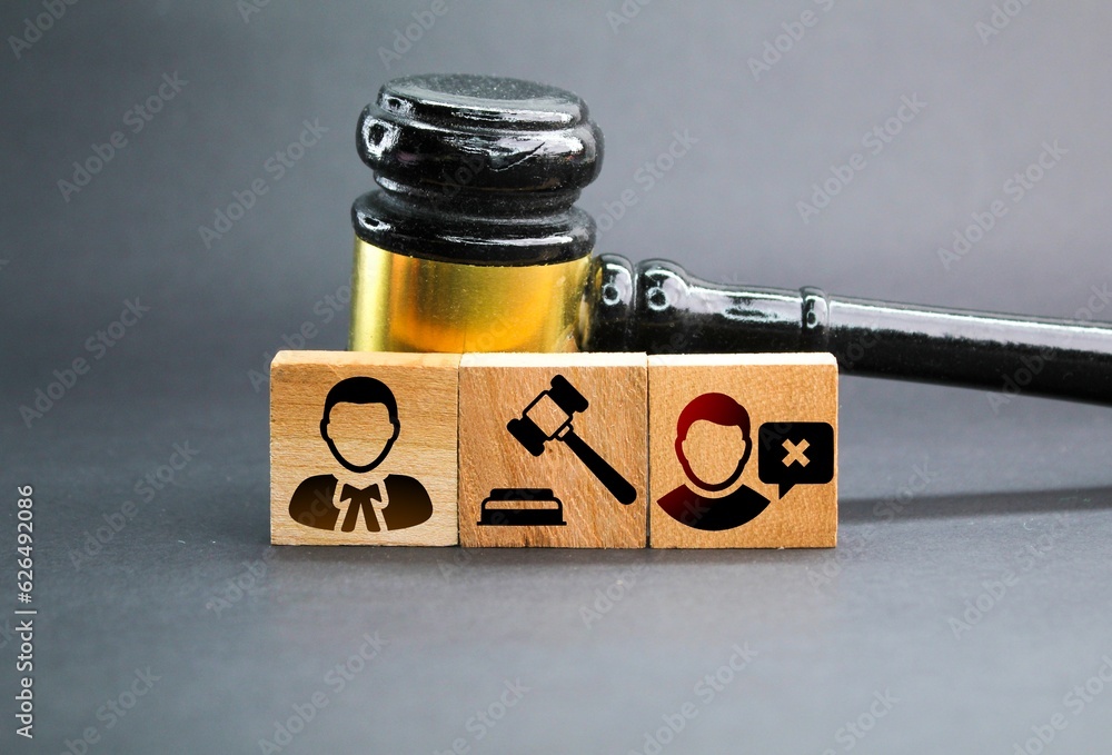 wooden square with three icons of the offender, the judge and the lawyer. the concept of judicial procedure. the concept of offenders being judged