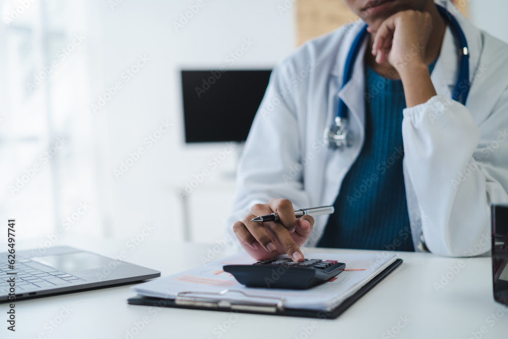 Doctor working in hospital use calculator, Healthcare and medical concept.