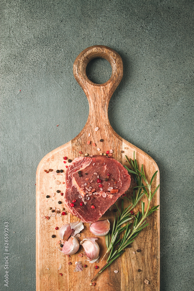 fresh, raw rib eye steak, on a chopping board, top view, no people,