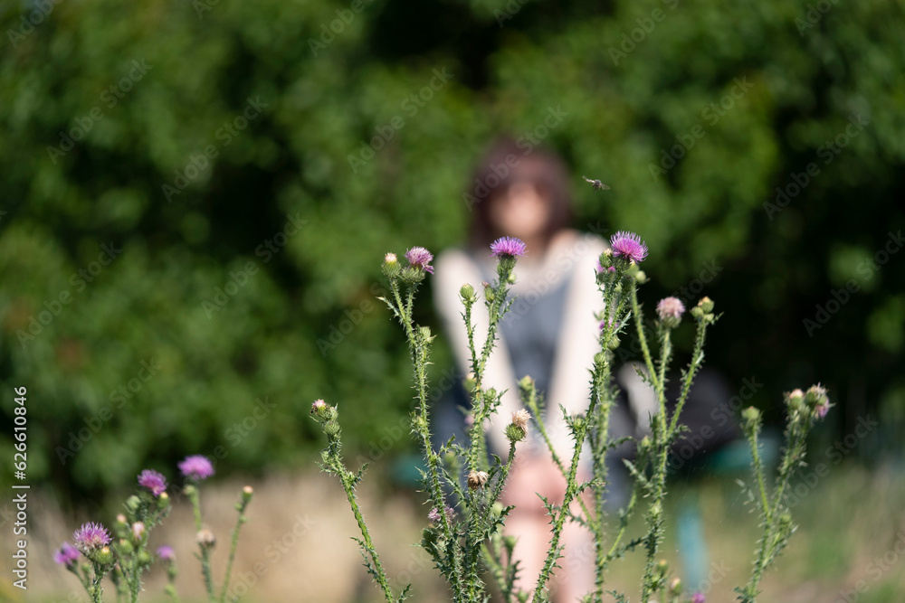 Blooming thorn, behind which the silhouette of a woman is visible in the distance