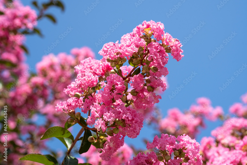 Lagerstroemia indica in blossom. Beautiful pink flowers on Сrape myrtle tree on blurred blue sky background. Selective focus.