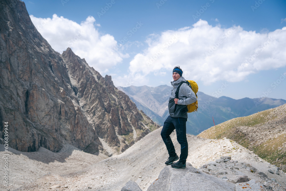 Adventure, Explore and Lifestyle Concept Composite. Adventurous Man Hiker on top Kyrgyzstan mountains with rocky peaks and clouds.
