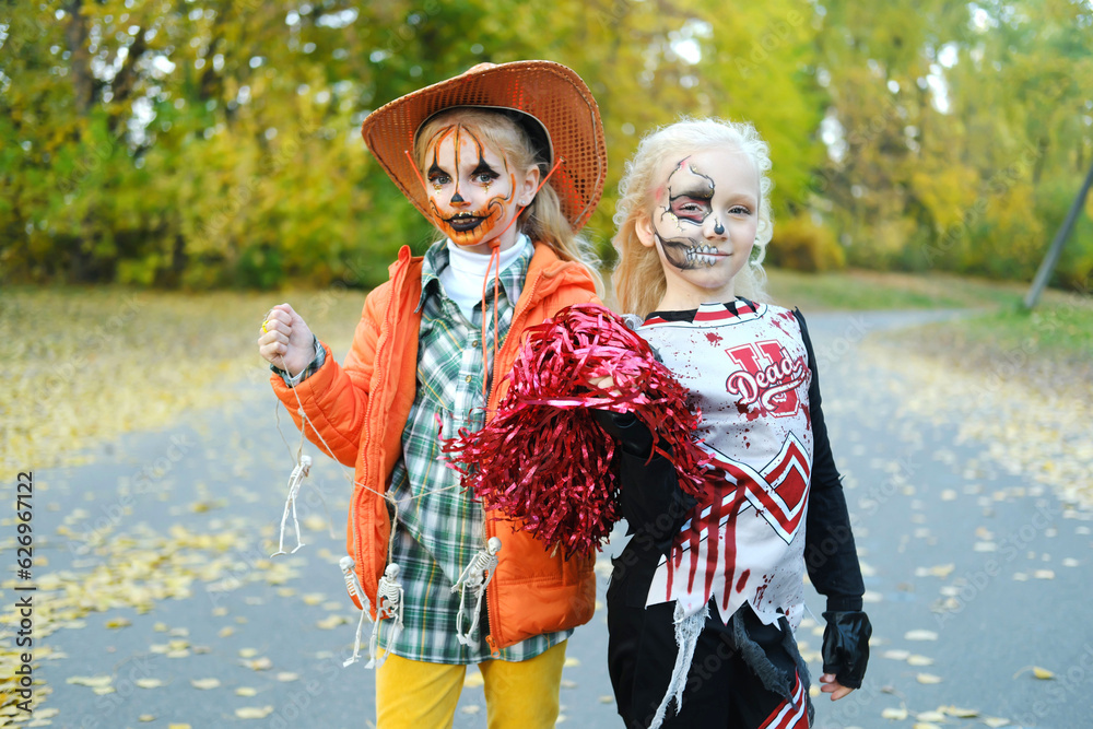 A girl in a cheerleader costume with half-face skeleton makeup and a girl with pumpkin makeup in a hat pose and look at the camera