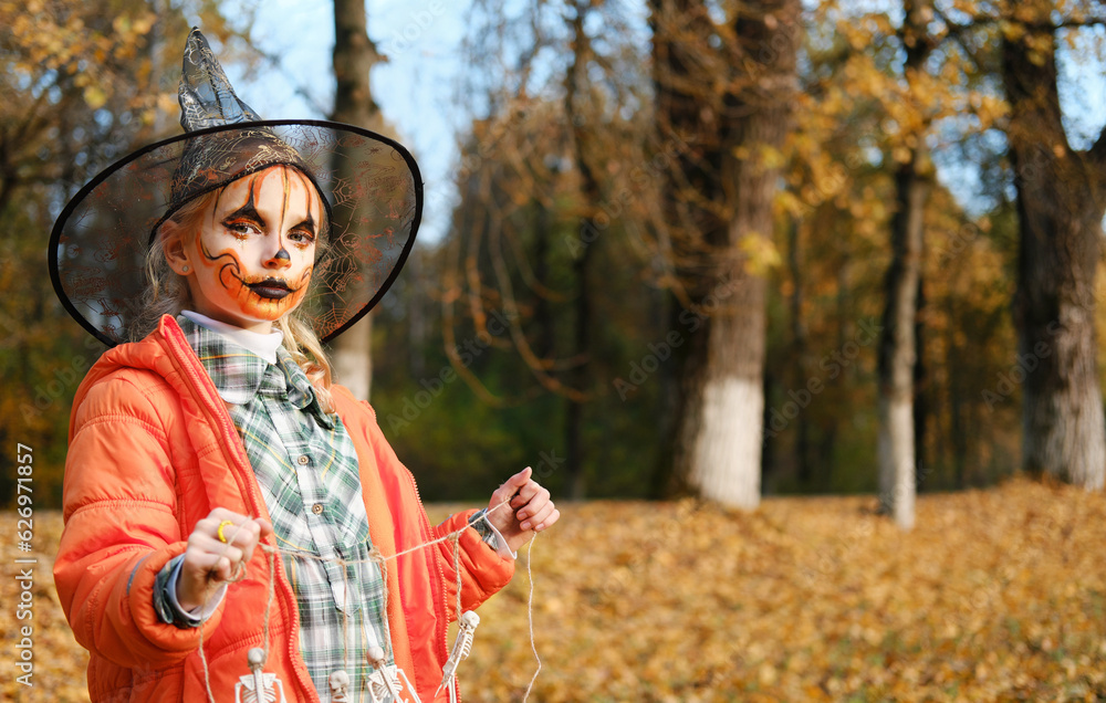 A child girl in an orange jacket, a witch's hat and with orange makeup on her face holds a decoration of skeletons in her hands. Halloween celebration