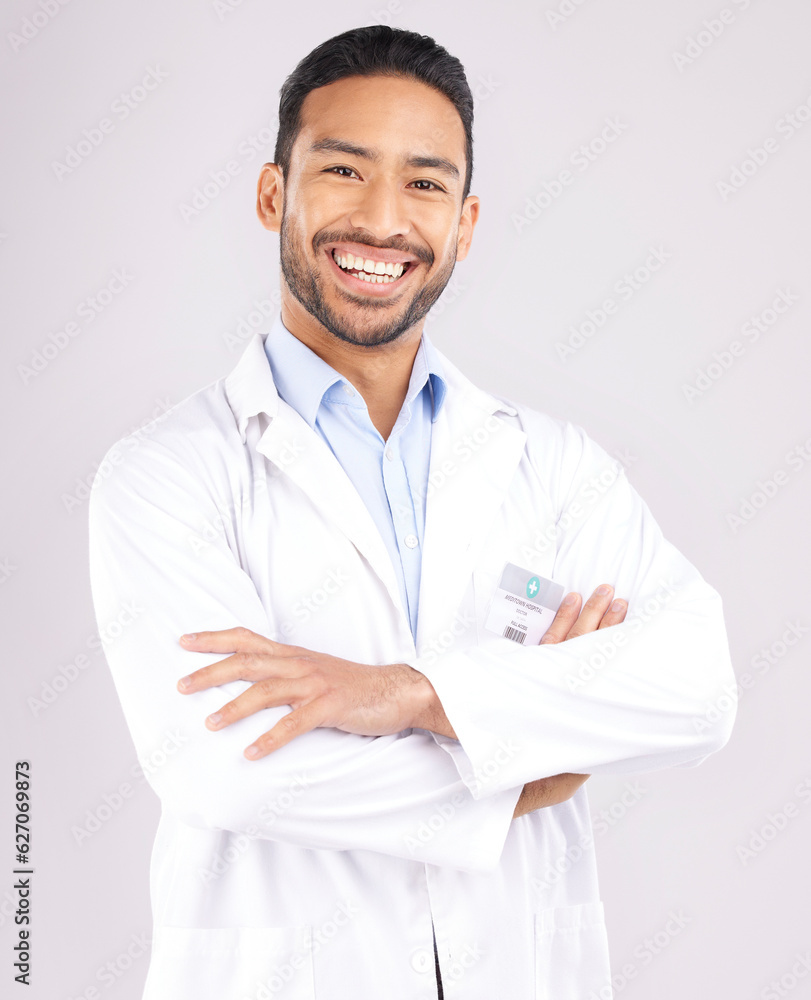 Man, portrait and scientist smile with arms crossed in studio isolated on a white background. Confidence, face and Asian doctor of science, research expert or happy medical professional from Cambodia