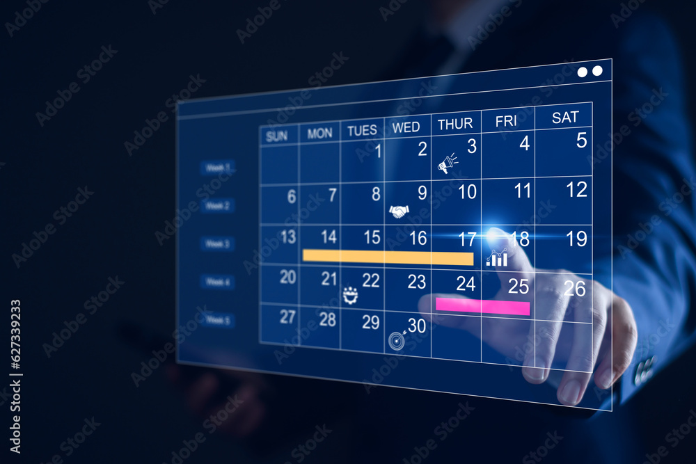 Work planning and business project management concept, virtual calendar screen and updating tasks and milestones progress planning to improve time management plan appointments, meetings efficiently