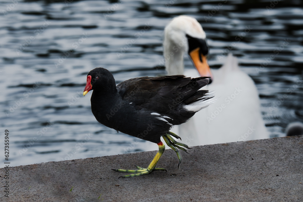 Moorhen strutting infront of a swan in lake.