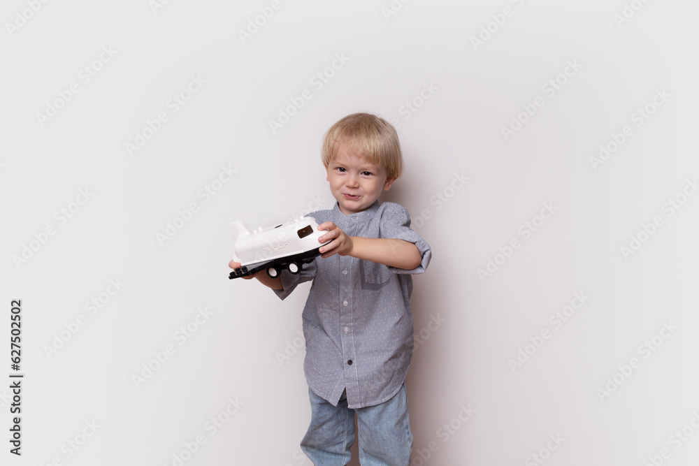 little cute european boy in a shirt holding a toy plane or rocket on a white background, child playing, air transport, childhood