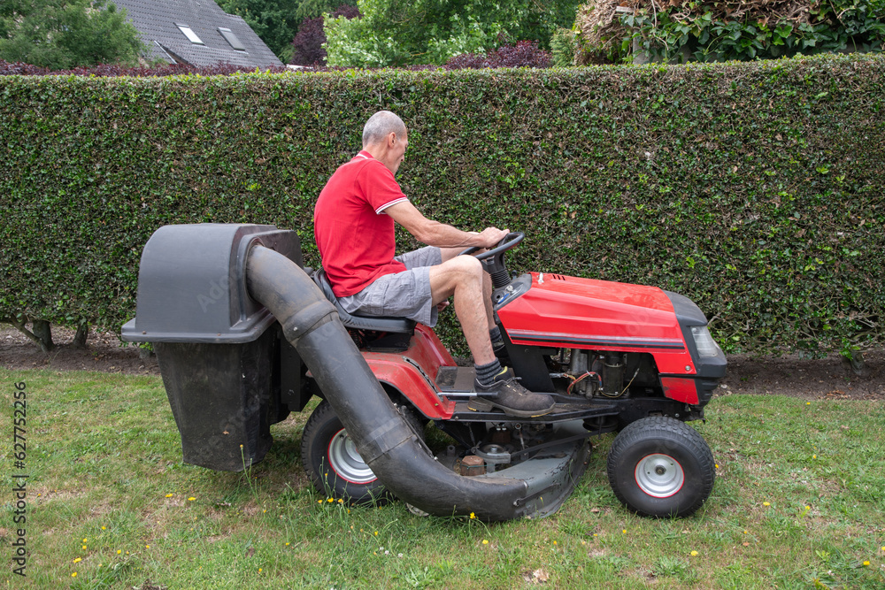 Lawn mower mows the grass, a middle-aged male gardener works on a mini tractor