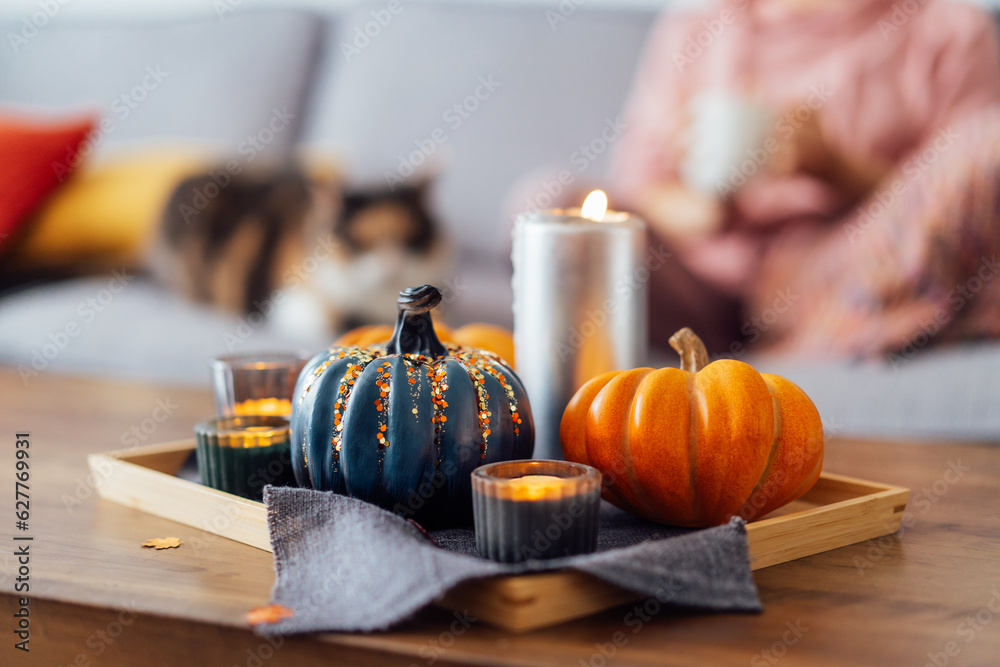 Autumn, fall cozy mood composition for hygge home decor. Small pumpkins, burning candles on tray with gray napkin on the coffee table with resting woman with cat in the living room. Selective focus