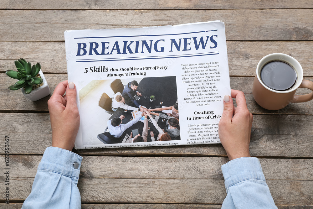 Woman reading newspaper with cup of coffee on grey wooden background