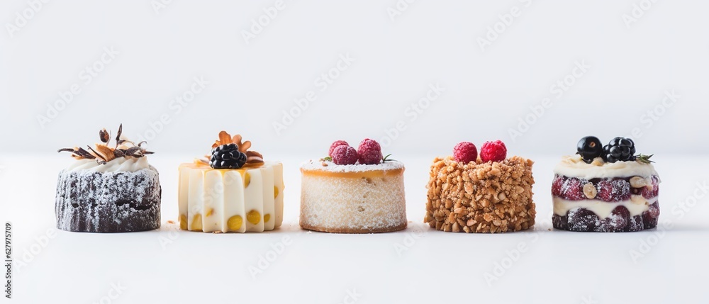 Set of delicious cakes. Small sweet cakes isolated on white background. Bakery products. Banner design