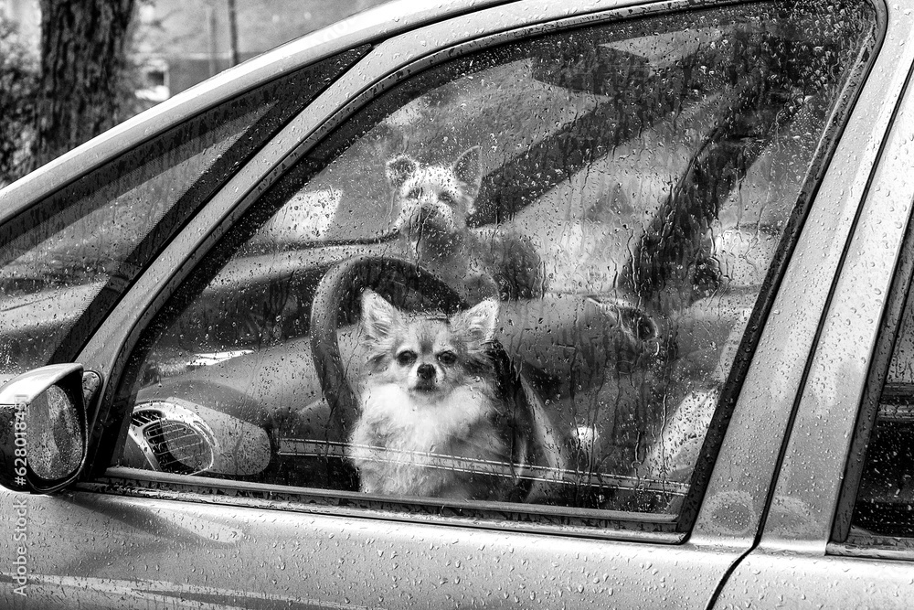 Dogs left alone in locked car. Abandoned animal concept.