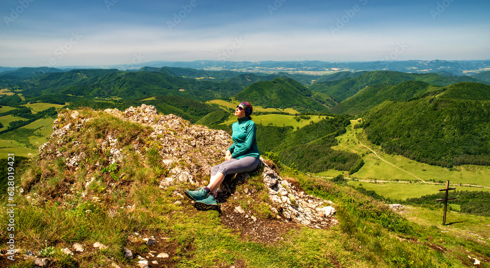Girl hiking sitting on top of the hill Strazov with beautiful landscape. Slovakia