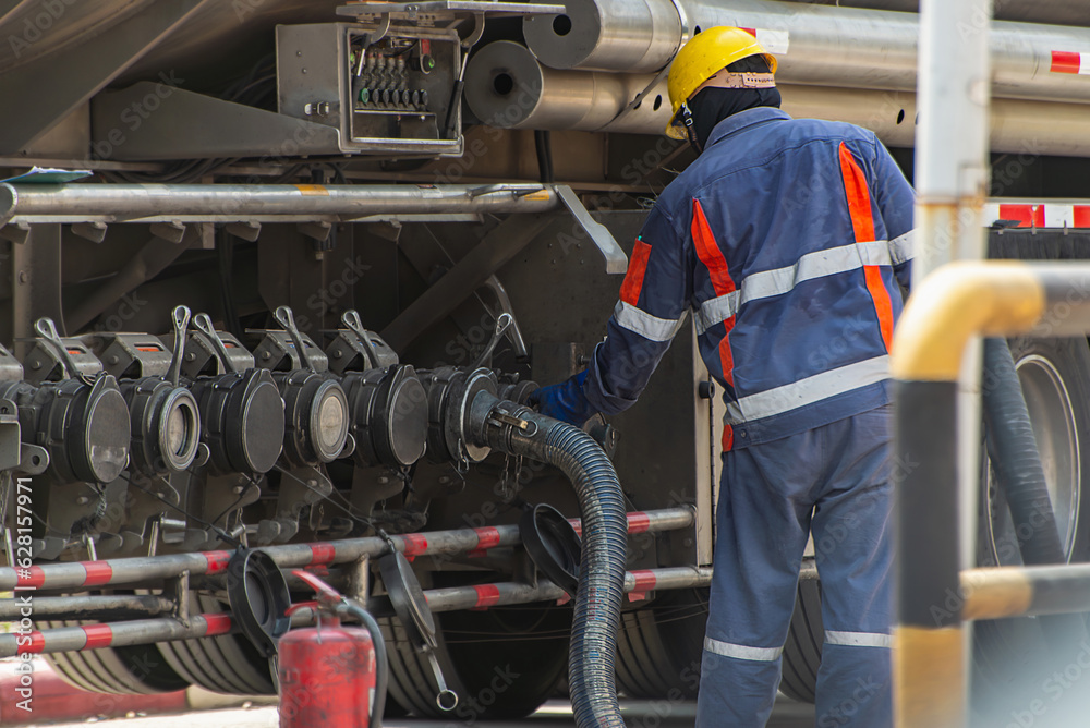 Fueling Up a Freight Transport Truck, A tanker truck driver delivers gasoline to a gas station