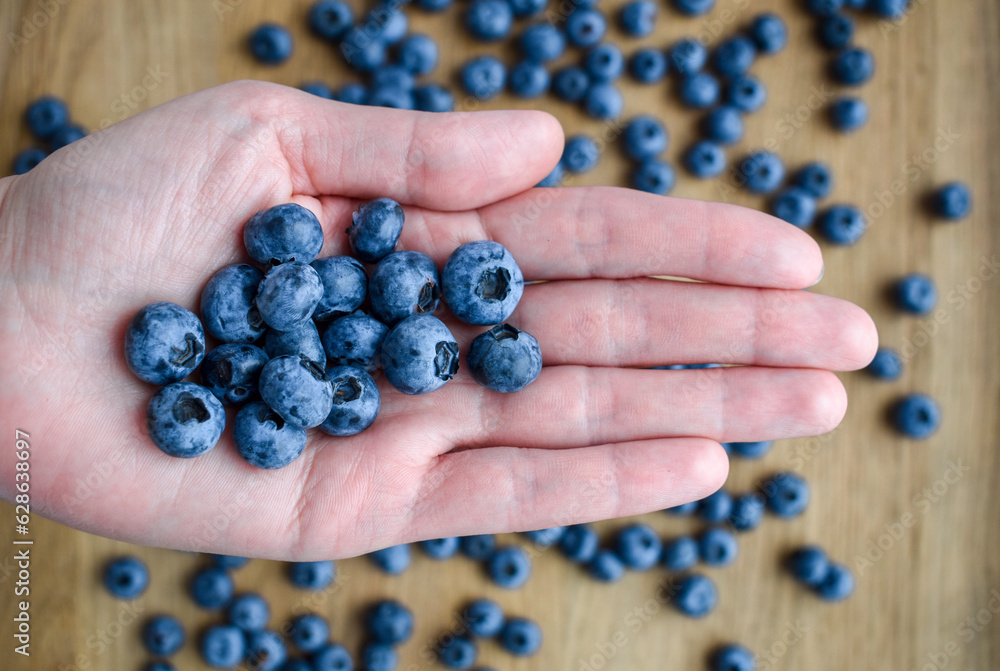 Beautiful blueberry on a wooden background. Вlueberry in the palm. Quality image for your project
