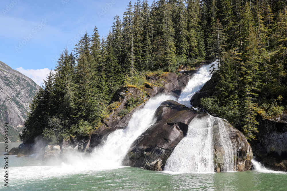 Icy Falls waterfall, located in Tracy Arm Fjord near the Sawyer Glaciers and Juneau, Alaska
