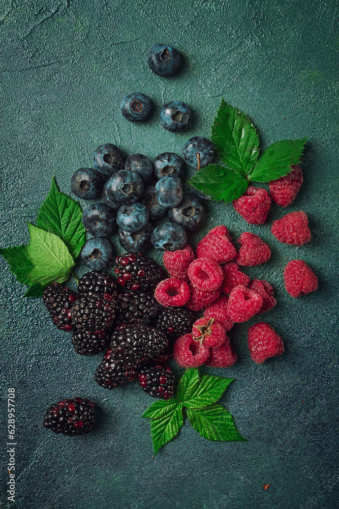 a mix of ripe berries, with leaves scattered on the table, raspberries, blackberries, blueberries, food background,