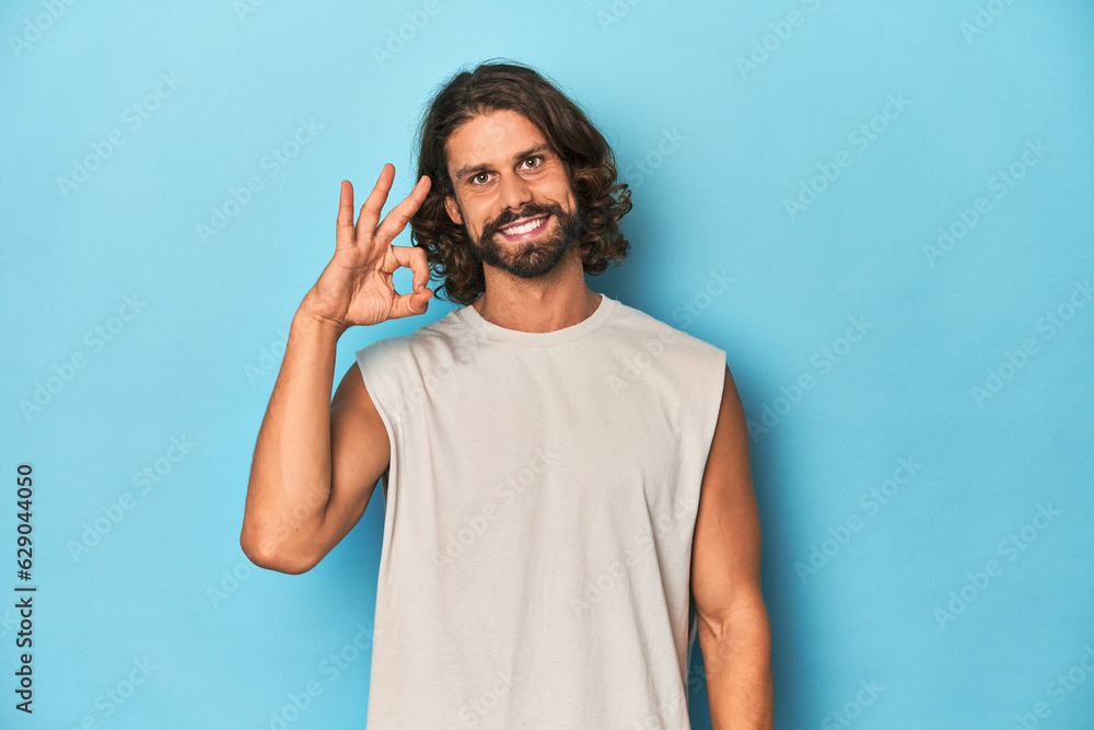 Bearded man in a tank top, blue backdrop cheerful and confident showing ok gesture.