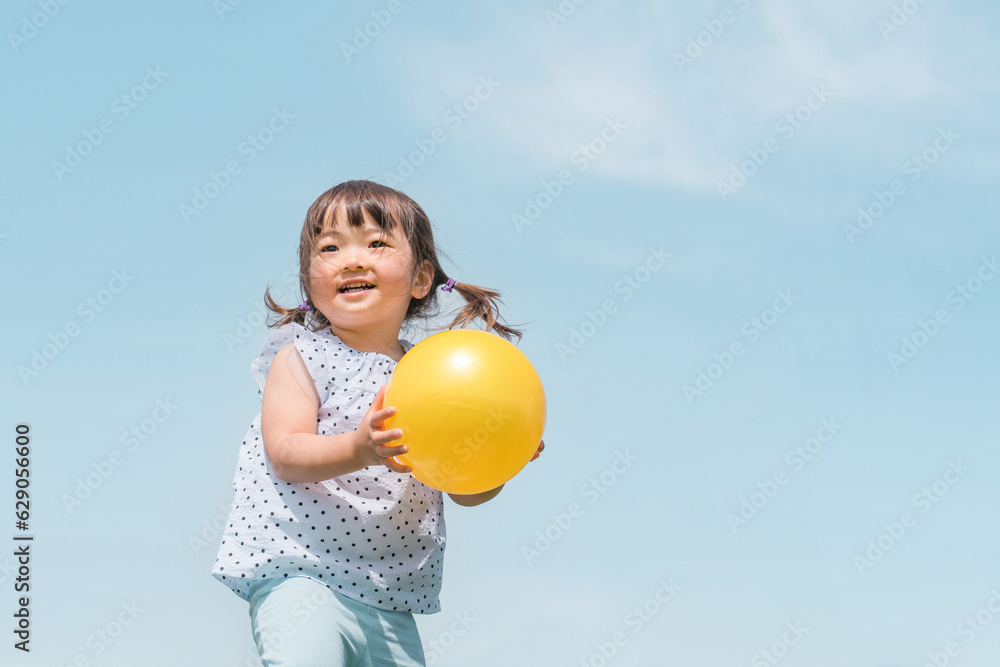 夏休みに青空の下でボール遊びをするアジア人の子供(女の子)