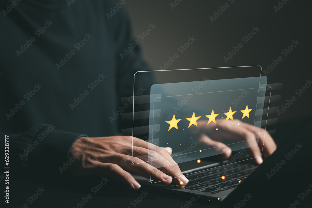 Satisfaction feedback survey concept. User give rating to service experience on online sites, reviews and reputation management diagram.
