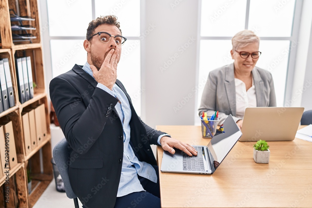 Hispanic young man working at the office covering mouth with hand, shocked and afraid for mistake. surprised expression