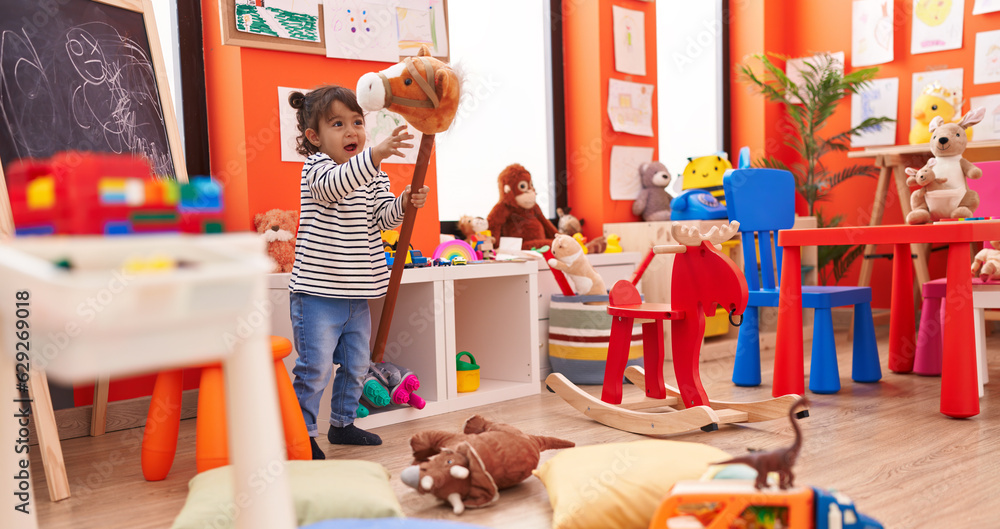 Adorable hispanic girl playing with horse toy at kindergarten
