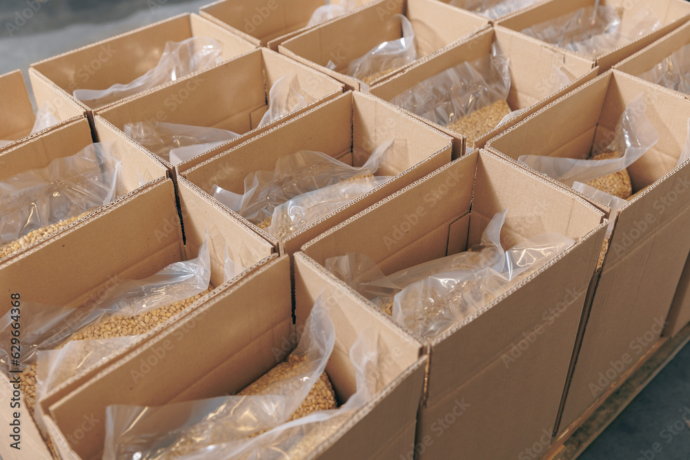 Production vacuum packed cedar nuts in cardboard box for delivery. concept food industry plant