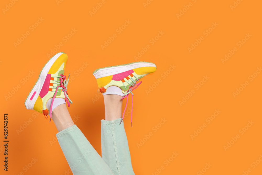 Woman wearing pair of new stylish sneakers on orange background, closeup. Space for text