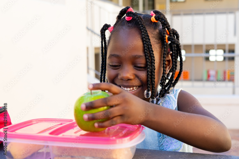 African american schoolgirl at table and having healthy lunch with apple outside elementary school