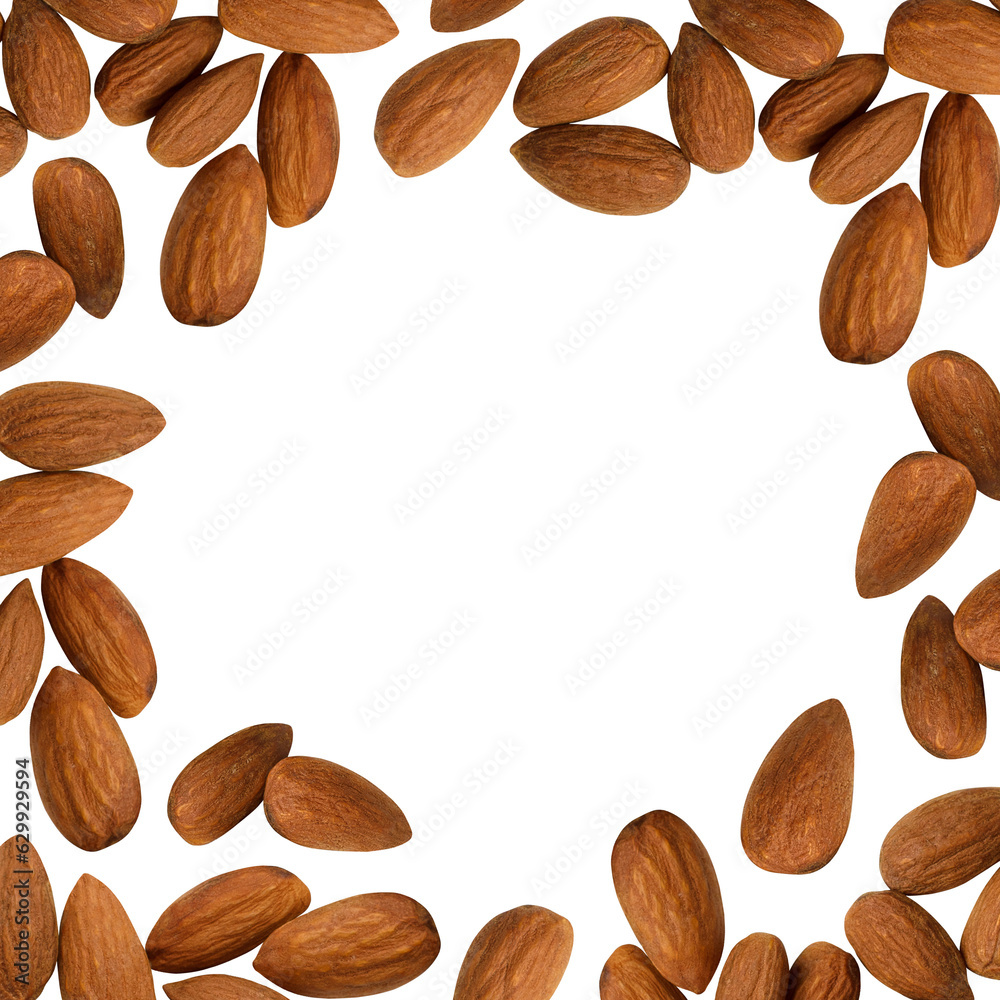 Many almond nuts isolated on transparent background. Scattered dry kernels png frame. Square banner layout with center copyspace. Social media posting. Vegetable oil packaging element. Natural snack