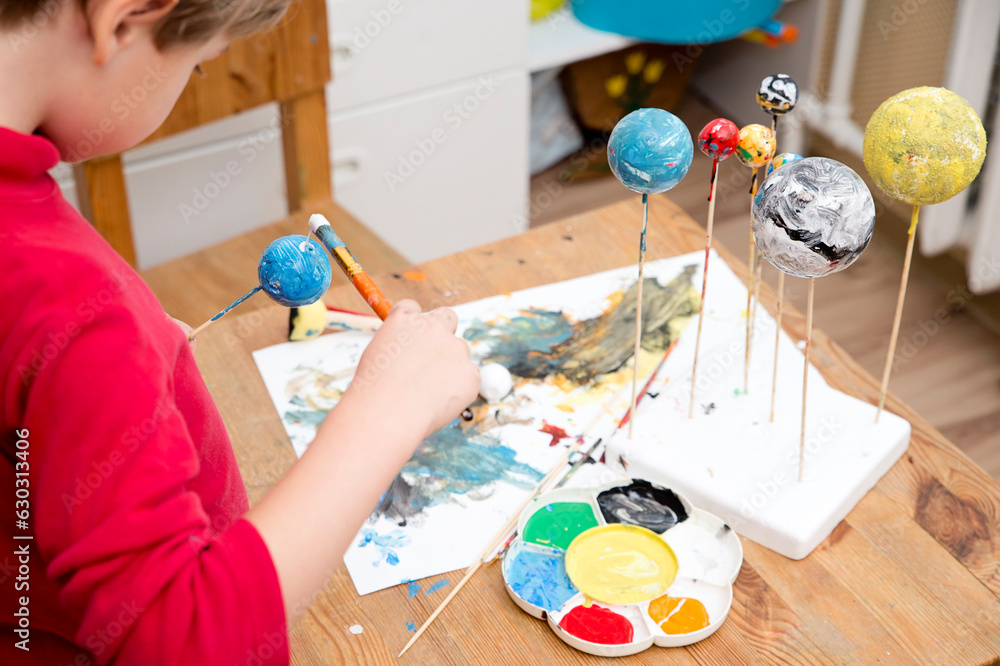 Boy painting styrofoam balls when making model of Solar System for school. Science project at home. Concept of teaching children. Developing creativity from an early age. Drawing with brushes and pain
