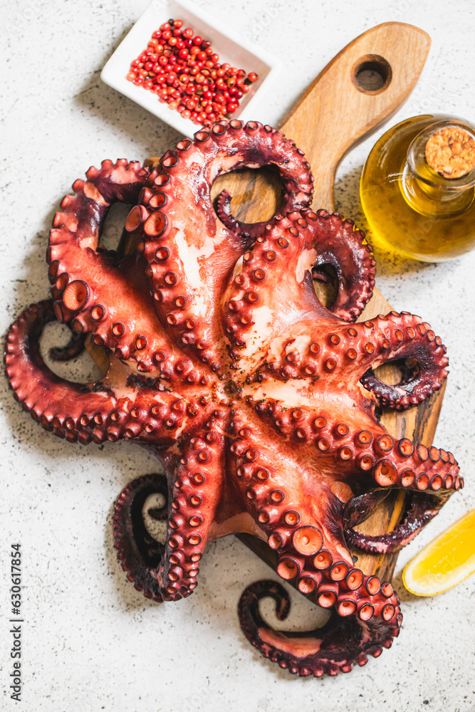 boiled whole octopus on a gray stone with lemon and pink pepper