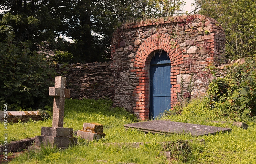 Old graveyard with a blue wicket, gate in Rosbercon New Ross Ireland.