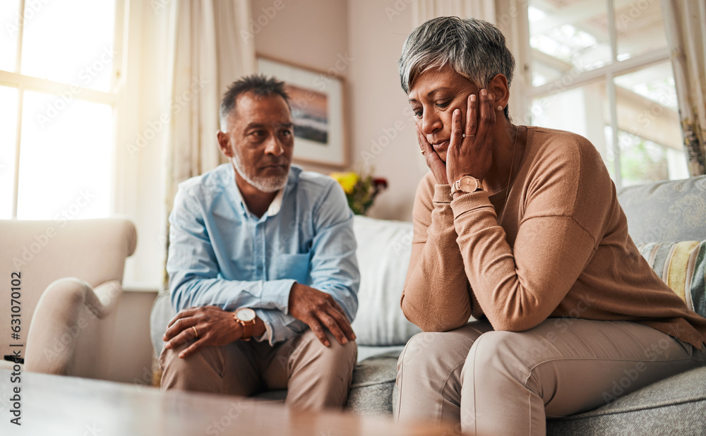 Fight, senior couple and divorce on sofa, stress and conflict with a breakup, depression and home. Angry, old woman or elderly man with mental health, cheating or sad with separation, fail or mistake
