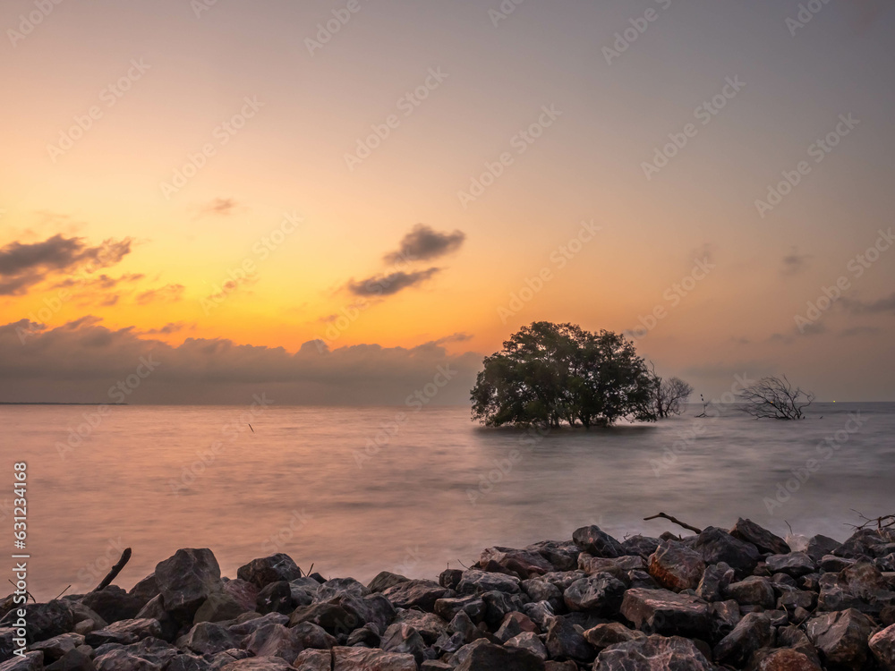 Sunrise twilight sky at sea beach with tree under sea water in morning Bangkok, Thailand