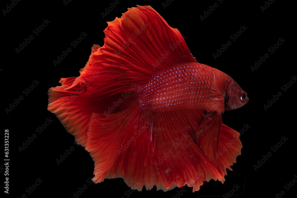 Red color Siamese fighting fish against a black background creates a striking and visually captivating image, showcasing the fish's vibrant and bold coloration.